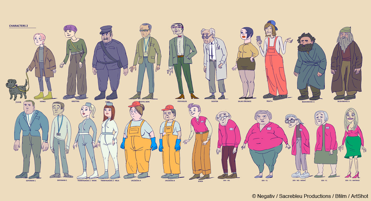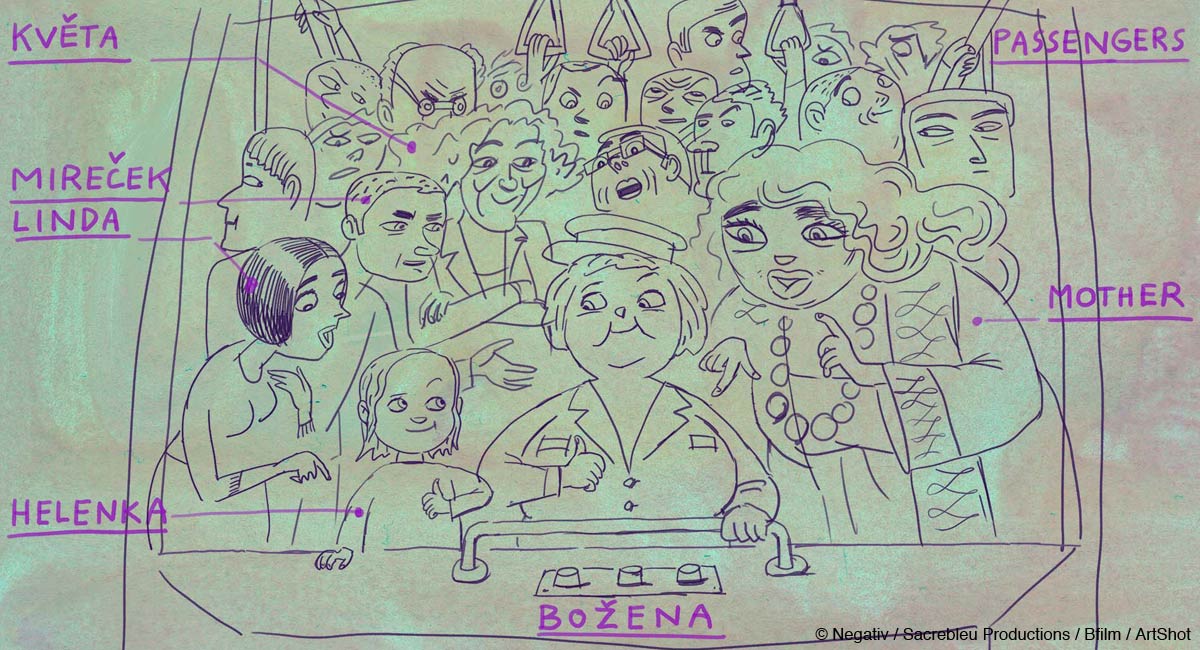 Michaela Pavlátová: In visuals, I focused the most on the main character, the tram driver Božena. She represents a normal, ordinary aging woman who has to gain the sympathy of the audience. I had to find the form of Božena that would be simple, yet have enough possibilities of facial expressions and be easy to animate.