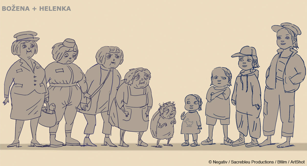 Other important characters are Božena’s deceased mother and her granddaughter Helenka. The challenge is to create Božena and Helenka through the changes of time, to design the types of Helenka from childhood to adolescence and also to create variations of Božena, who is transforming from her 60-ies to the form of a beetle.